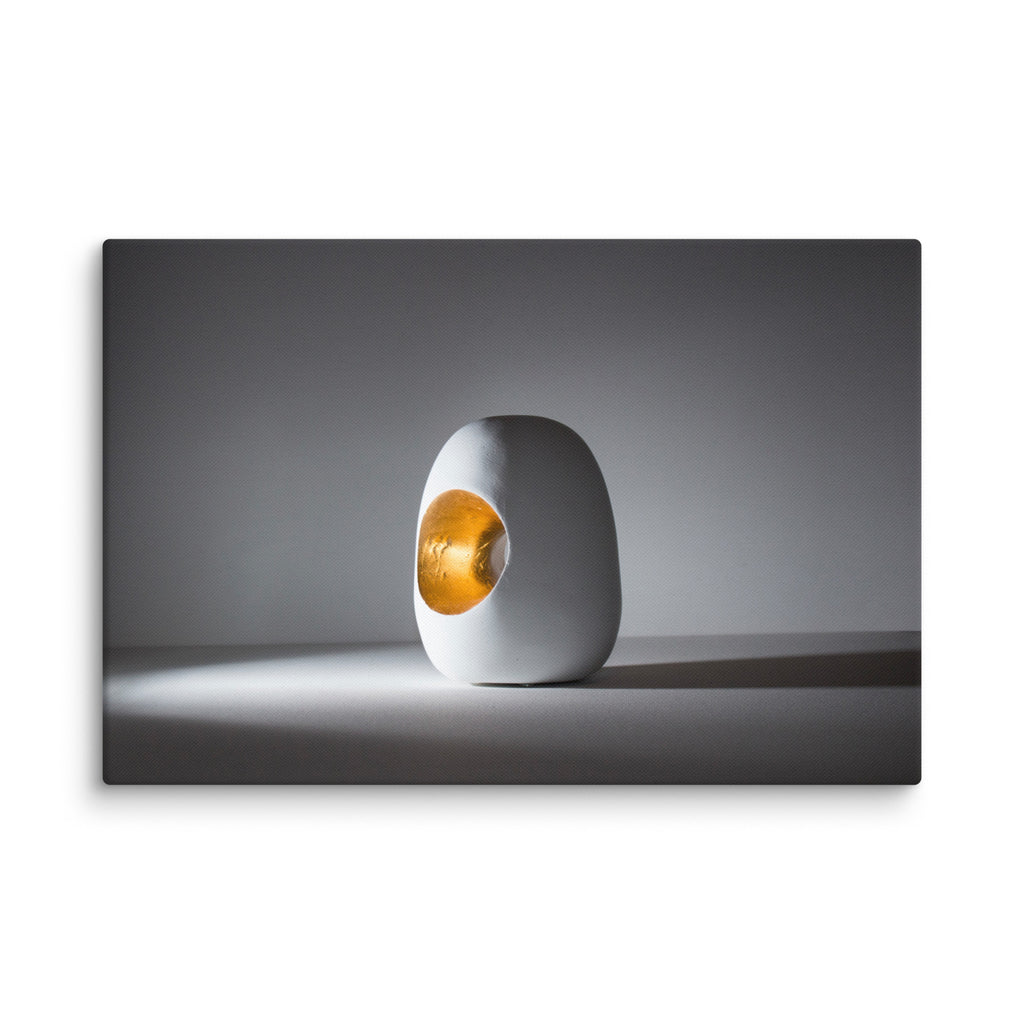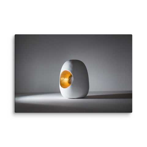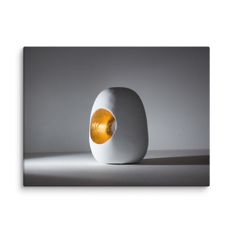This fine art canvas print from Maxwell Alexander’s Aurora: Window to the Universe series introduces a quiet, celestial presence into any interior, infusing the room with a sense of spacious calm and sculptural purity. Each work begins as a hand-carved gypsum form shaped through an intimate, meditative process of cutting, sanding, polishing, painting, and gilding. Alexander then photographs the sculpture in a controlled still-life environment, translating the physical object into a luminous visual field where light becomes the final sculptor.